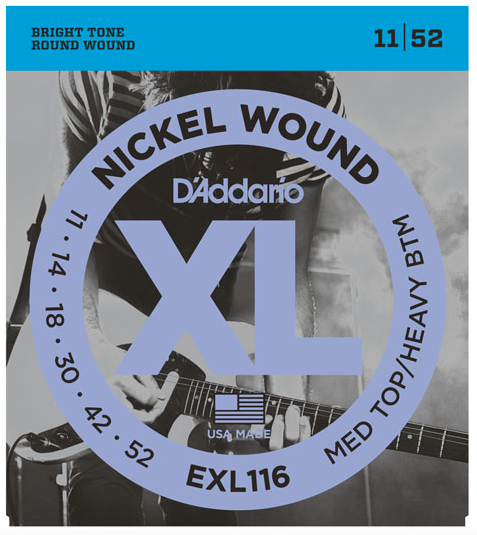 EXL116 is a hybrid set with an .011 on top and a .052 on the bottom, giving the strings moderate